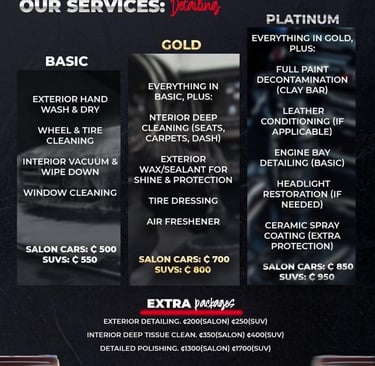 Pick from our different packages that fit your detailing needs and budget for the best experience you can get in Ghana.